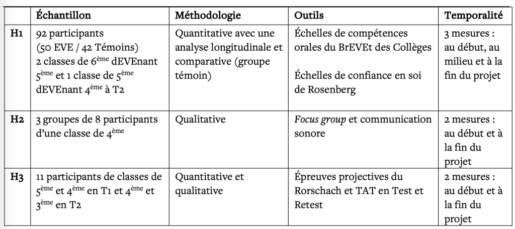 Notre équipe de recherche a ainsi analysé les effets psychologiques du projet EVE auprès d’adolescents de 11 à 15 ans dans un contexte scolaire selon trois dimensions : la qualité de l’estime de soi et des compétences orales (H1) ; l’accompagnement et l’intégration de la mue vocale (H2) ; la nature et la qualité des changements des processus intrapsychiques adolescents comme la représentation de soi, celle du corps, des affects, de la relation à l’autre (H3).